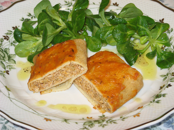 V poslednom momente prišla manželka so skvelou myšlienkou, spraviť mäsové palacinky. Samozrejme, museli byť nejak po novom, nie naše klasické kuracie palacinky Hortobágy. Tak sme vymysleli túto bravčovú verziu mäsových palaciniek, plnených mäsovo-šampiňónovo-smotanovou plnkou, podobnou soté. A aby bol obed plný noviniek, nechal som sa nahovoriť na prílohu z poľného šalátu s vinaigrette dressingom. Na pohľad ten šalát síce vyzerá ako jednoduchá poľná burina (možno aj je 🙂 ), ale musím uznať, bol k pomerne ťažkému hlavnému jedlu celkom príjemný. Asi starnem, toto by som pred desiatimi rokmi nikdy nepriznal 😉 .