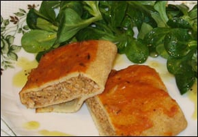 - Na každú palacinku vložím 2 lyžice plnky a zabalím ju do formy obálky, podobne ako sme plnili chimichangas.