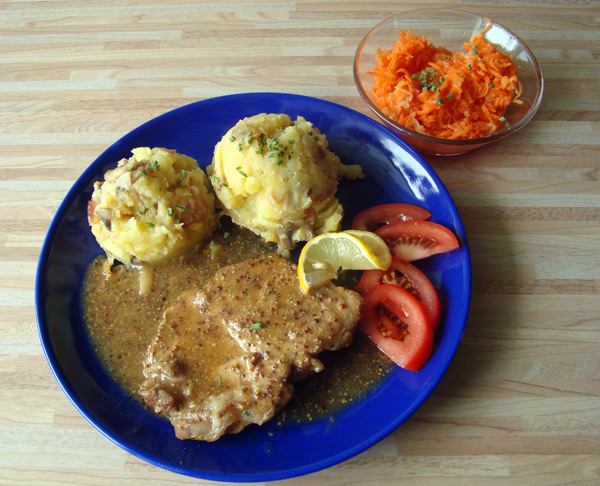 - Bravčové mäso nakrájame na tenké plátky, naklepeme, jemne posolíme a potrieme špeciálnou horčicou s korením (tradičná horčica s vínnym octom a horčicovými semiačkami).