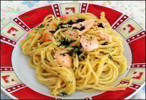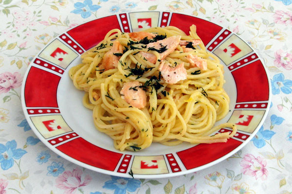 A toto je prvý pokus, leto pripomínajúce lososovo-citrónové špagety, ktoré nie sú až také ľahučké na trávenie ako sa zdajú (vaječný základ mi pripomína carbonaru, aj keď sú všetky ostatné suroviny iné), chuťovo sú ale výborné. Trpká aróma citrónovej kôry, chutná kyslosť citrónovej šťavy, aróma kôpru a hustý krémovitý základ omáčky tvorí výborné pozadie pre jemné lososové mäso a samozrejme špagety. V sprievode s chladným bielym vínkom je to ideálne jedlo pre letné večere na terase.