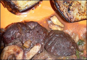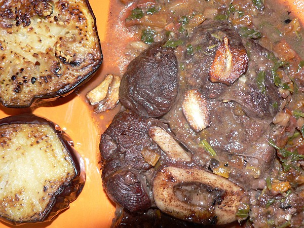 Mäso musí byť natoľko jemné, aby sa dalo jesť aj lyžicou. Ak je dostatočne jemné vyberieme z panvice a dáme bokom. Sofrito prepasírujeme (ak sa Vám podarilo nakrájať zeleninu na veľmi drobné časti, tento krok môžete vynechať), pridáme gremolatu, čiže zmes petržlenu, cesnaku a citrónovej kôry a trošku prihrejeme. Pridáme čerstvý rozmarín, oregáno a bazalku. Dôkladne premiešame a pridáme maslo, ktoré omáčku zhustí a zároveň zjemní. Ak sme hotoví, omáčku prilejeme na mäso a posypeme čipsami z cesnaku. Podávame s grilovaným baklažánom.