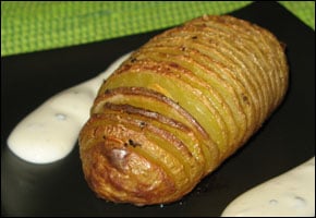Po umučených zemiakoch sme teraz vyskúšali ďalšiu variáciu, ktorú som kvôli výzoru nazval zemiakovou húsenicou. Trik je v tom, že sa ešte surový zemiak nareže na tenké plátky (asi tak do ¾ zemiaku, aby sa plátky neoddelili), medzi ktoré sa dajú rôzne chuťovky. Pôvodný recept, ktorý ma inšpiroval hovoril síce len o cesnaku, ale neboli by sme to my, keby sme tam nenapchali aj slaninu. A som si istý, že sa dá vymyslieť ešte milión kombinácii.