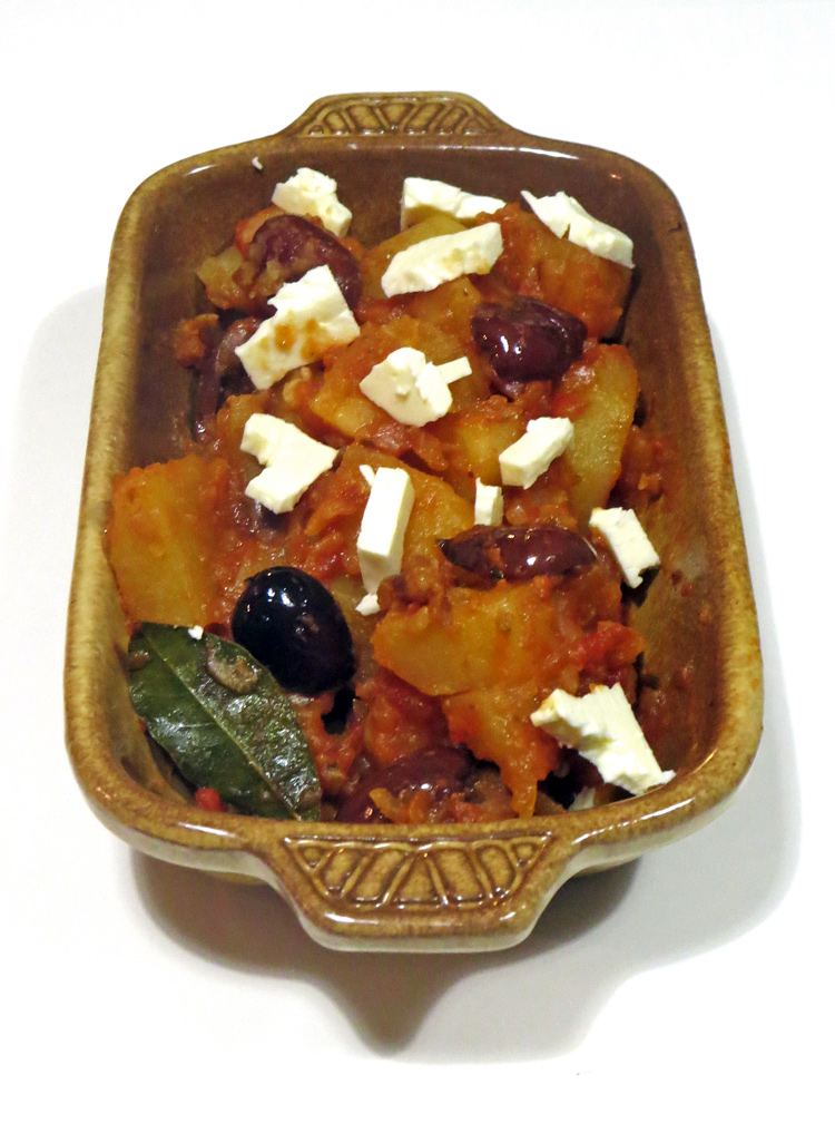Zemiakové yiachni je grécke jedlo, ktoré sa spôsobom prípravy veľmi podobá na u nás dobre známy zemiakový paprikáš, alias paprikáš krumpli (mimochodom recept na jeho prípravu nájdete tu). Jeho zloženie však plne zodpovedá gréckej náture. Idú tam paradajky, oregano, grécke olivy a syr feta. Výsledkom je pomerne ľahké a chutné jedlo, ktoré sa iste výborne hodí do horúceho leta.