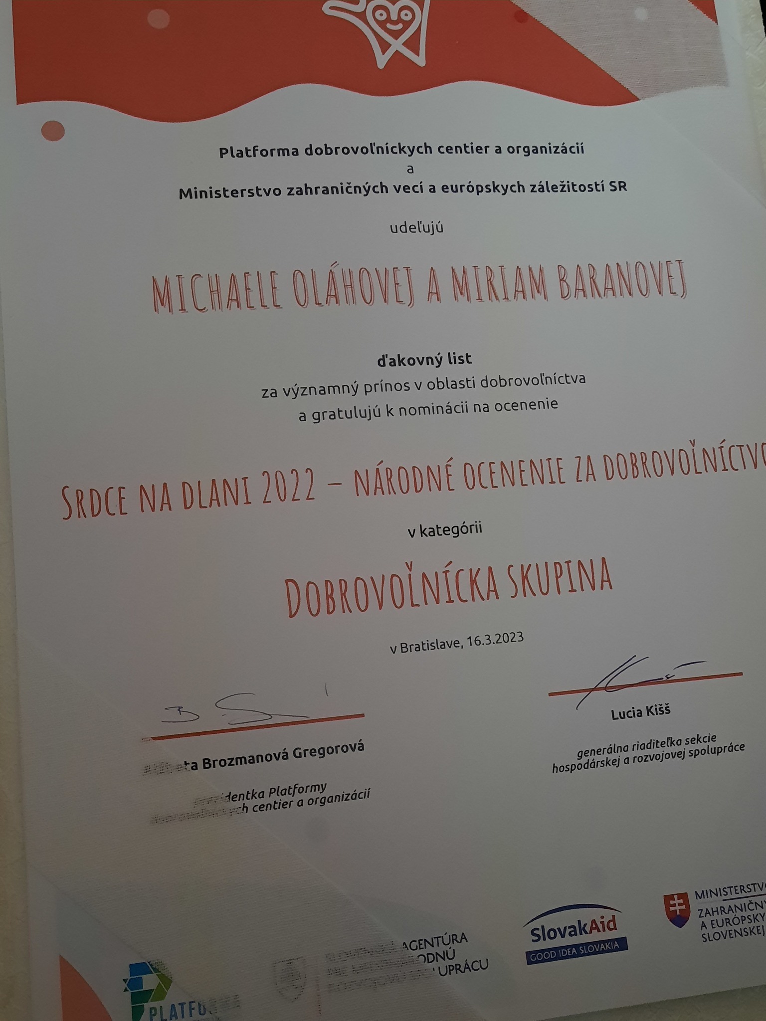 V marci tohto roka Platforma dobrovoľníckych centier a organizácií usporiadala národné ocenenie za dobrovoľníctvo Srdce na dlani v Bratislave a to na pôde Ministerstva zahraničných vecí a európskych záležitostí SR, kde sa zišli všetci nominovaní zo všetkých kútov Slovenska, ktorí prešli výberovou komisiou až do celonárodného kola. Pri tejto príležitosti sa Michaela a Miriam osobne stretli aj s prezidentkou SR Zuzanou Čaputovou.