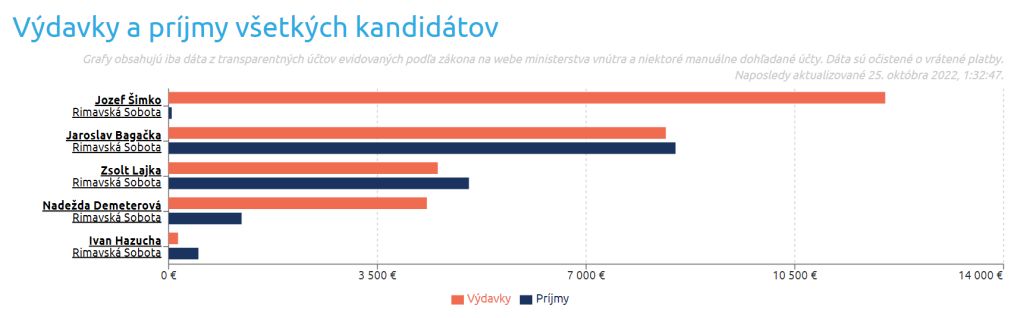 Pripomíname, že ide o priebežné sumy, ktoré kandidáti na kampaň vynaložili k dnešnému dňu (25. 10. 2022) a ktoré už figurujú na ich transparentných účtoch.