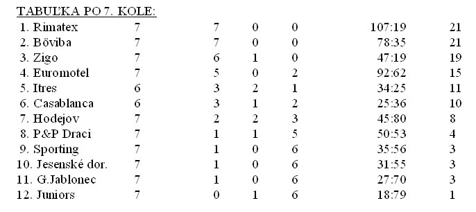 8. kolo sa odohrá dňa 17. januára (piatok): 16.00 Casablanca – Itres (odložený zápas z 5.kola), 17.00 Jesenské dor.- Hodejov, 17.50 Ites – Sporting, 18.40 Casablanca – Euromotel, 19.30 Zigo- Böviba, 20.20 P&P Draci – Rimatex, 21.10 G.Jablonec - Juniors.