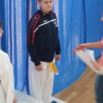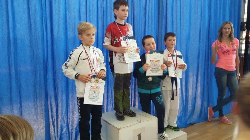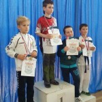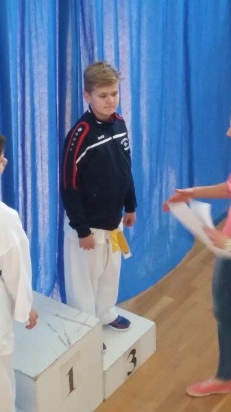 Po dekorovaní medailistov v súborných cvičeniach kata a prestávke pokračovala súťaž v športovom zápase kumite. Ani v športovom zápase sme sa nestratili, keď najprv vo váhovej kategórii chlapcov 8 – 9 roční, Juraj Prč vybojoval pekné 3. miesto.