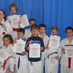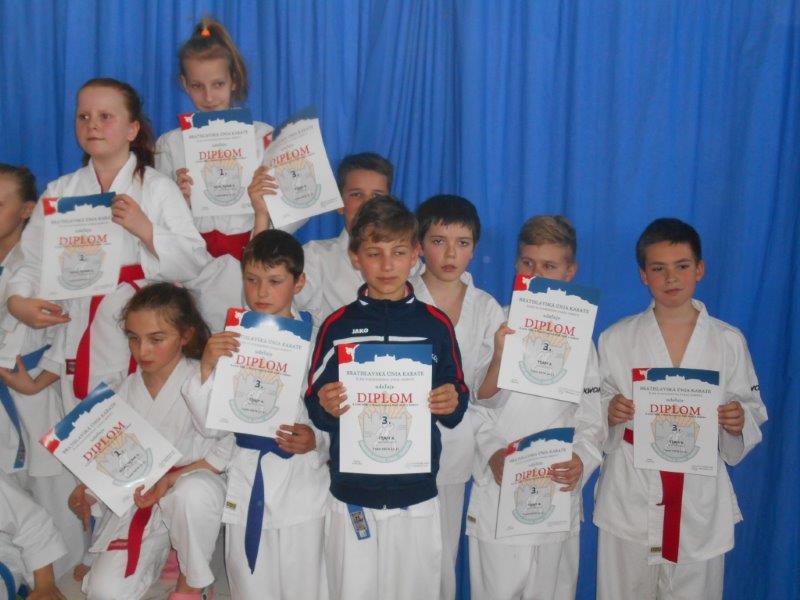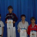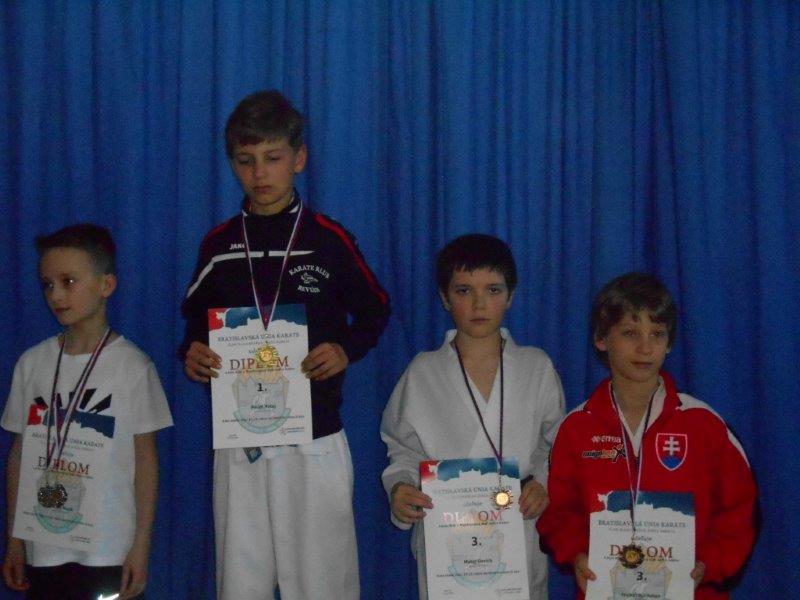 Po dekorovaní medailistov v súborných cvičeniach kata a prestávke pokračovala súťaž v športovom zápase kumite. Ani v športovom zápase sme sa nestratili, keď najprv vo váhovej kategórii chlapcov 8 – 9 roční, Juraj Prč vybojoval pekné 3. miesto.