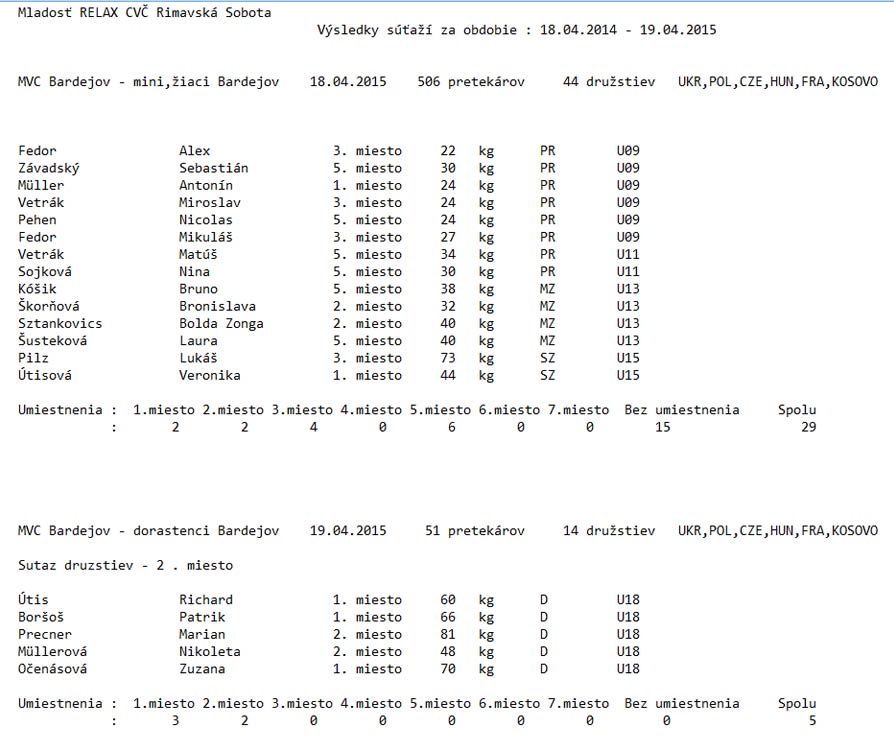 Džudisti TJ Mladosť CVČ Relax obohatili svoju zbierku medailí o ďalších trinásť. Získali ich na Medzinárodnej veľkej cene o pohár primátora mesta Bardejov. Ako ďalej Rimava.sk informoval Jozef Nociar, tréner TJ Mladosť CVČ Relax Relax, súťaže, ktorá sa konala počas dvoch dní, 18. až 19. apríla, sa zúčastnilo viac ako štyridsať družstiev z Maďarska, Čiech, Chorvátska, Ukrajiny, Ruska, Poľska, Francúzka, Srbska, Kosova a Slovenska. Celkovo sa do boja o medaily zapojilo približne päťsto pretekárov.