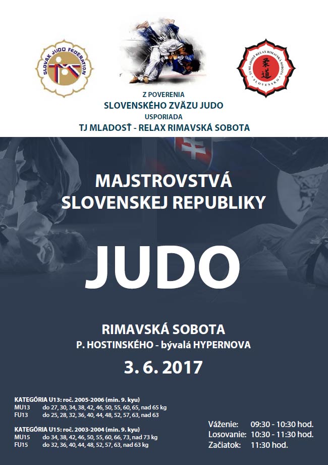 Rimavskosobotskí džudisti ťahajú sériu turnajov. Po Veľkej cene mesta, minulotýždňovej Slovenskej národnej lige dorastencov a dorasteniek ich najbližšie čakajú majstrovstvá Slovenska, ktoré sa uskutočnia v sobotu, 3. júna. Ich dejiskom aj tento raz budú priestory bývalého hypermarketu Hypernova v Rimavskej Sobote. Svoje sily na štyroch tatami si zmerajú mladší žiaci a žiačky (ročník 2005 – 2006) ako aj starší žiaci a žiačky (ročník 2003 – 2004). Ako ďalej Rimava.sk informoval Jozef Nociar, predseda TJ Mladosť Relax Rimavská Sobota, ktorá majstrovstvá organizuje, boje sa strhnú o 11:30 hod.