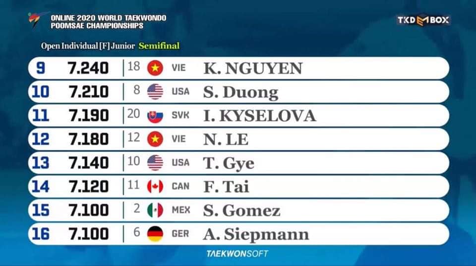 Juniorka Ivana Kyseľová (dcéra obidvoch Tomášových trénerov, pozn. red) z rovnakého klubu sa koncom roka zúčastnila majstrovstiev sveta Online Poomsae 2020, ktoré sa organizovalo v hlavnom meste Soul v Kórei. Jej prvá premiéra na prestížnej súťaži v celosvetovej konkurencii špičkových súperiek v kategórii junioriek bola previerkou a zároveň motiváciou do budúcich súťaží. Ivanka sa spomedzi 182 pretekárov prebojovala do semifinále a tam sa vo svojej skupine umiestnila na 11. mieste. Hoci sa jej nepodarilo postúpiť do finálového kola, jej dosiahnutý výkon bol nad očakávania.