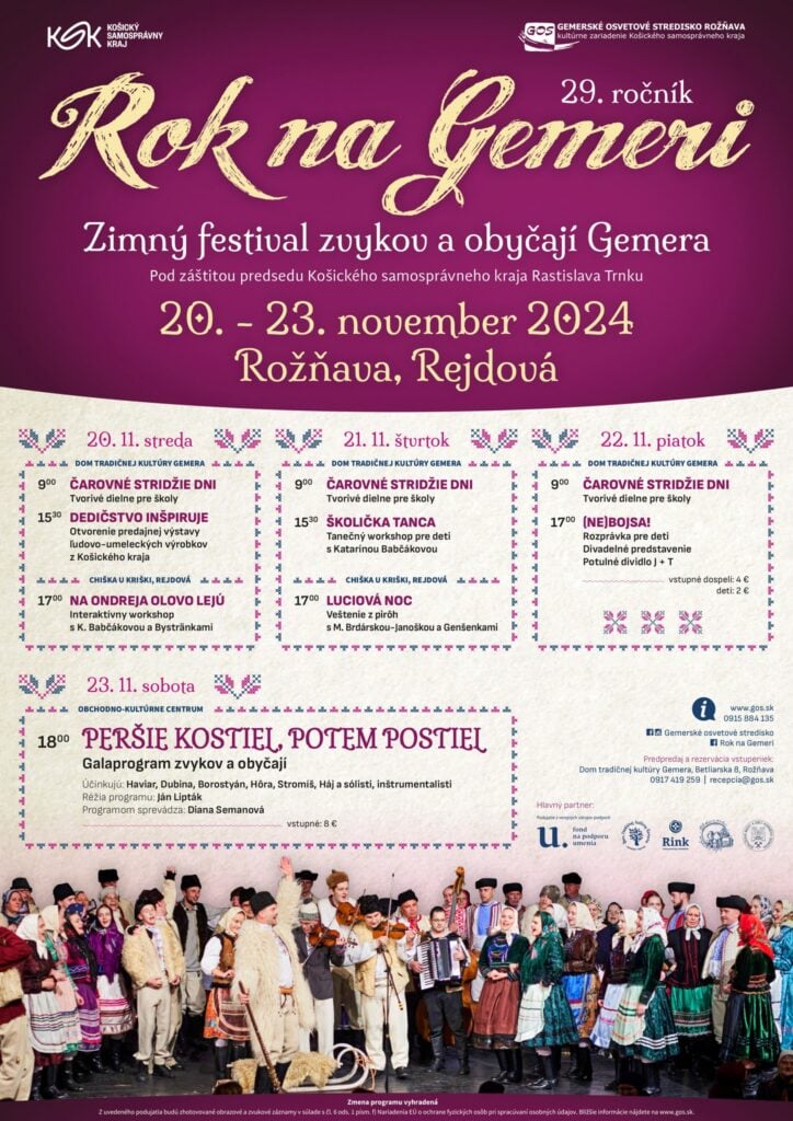 ROŽŇAVA - Gemerské osvetové stredisko opäť otvára dvere do sveta tradícií, remesiel a zvykov Gemera v rámci už 29. ročníka zimného festivalu Rok na Gemeri. Festival, ktorý sa uskutoční pod záštitou predsedu Košického samosprávneho kraja Rastislava Trnku, bude prebiehať od 20. do 23. novembra v Rožňave a Rejdovej. Podujatie prinesie bohatý program plný tvorivých dielní, workshopov, tradičnej hudby a folklóru.