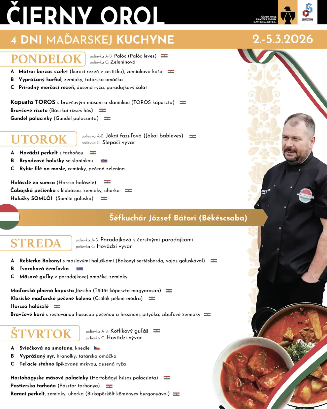 V reštaurácii Čierny orol sa začiatkom marca bude rozliehať vôňa papriky, pomaly duseného mäsa a poctivých domácich jedál. Už od pondelka 2. marca do štvrtka 5. marca tu štartuje gastronomická akcia 4 dni maďarskej kuchyne, ktorá prinesie to najlepšie z tradičných chutí našich južných susedov.