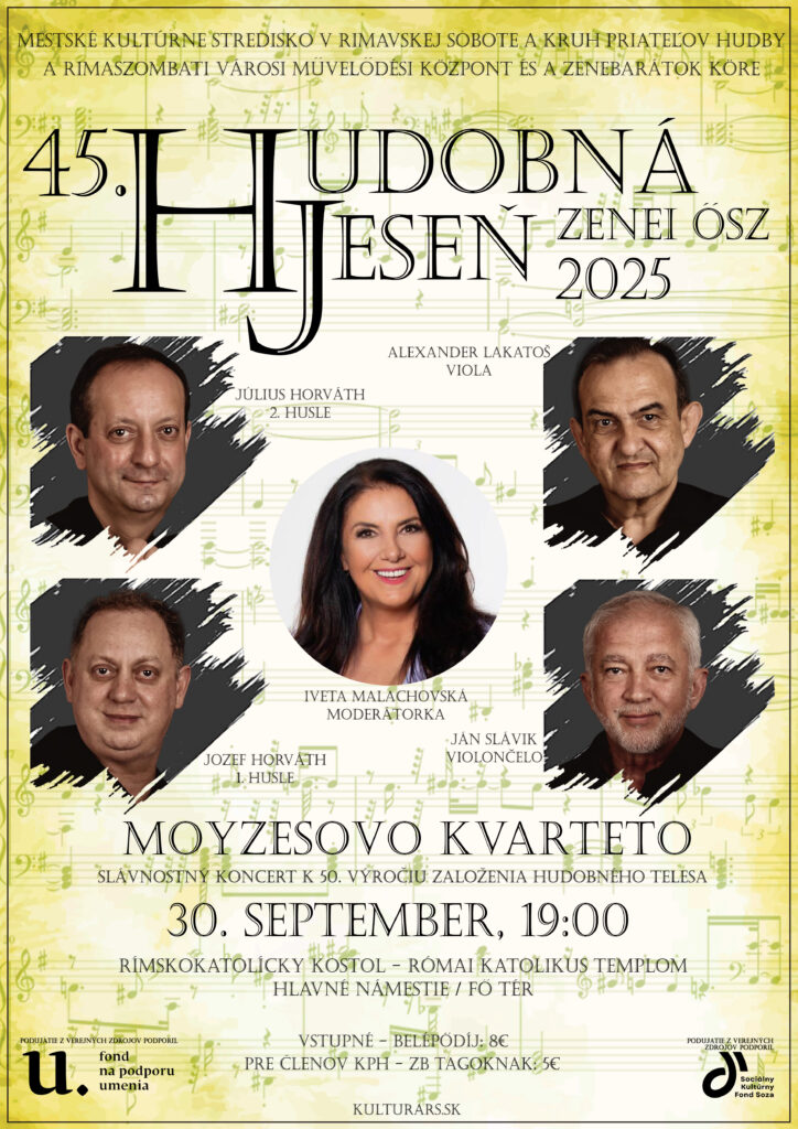 Jeseň v Rimavskej Sobote sa začína v hudobnom štýle. Už v utorok 30. septembra o 19:00 sa v Kostole sv. Jána Krstiteľa uskutoční koncert, ktorý poteší všetkých milovníkov klasickej hudby. Do mesta zavíta Moyzesovo kvarteto, jeden z najvýznamnejších slovenských komorných súborov, ktorý tento rok oslavuje svoje 50. výročie vzniku.
