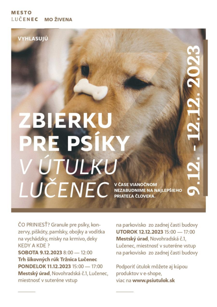 Samospráva a OZ Živena chcú pomôcť aj miestnemu útulku. Vyhlásili preto zbierku krmiva i príslušenstva, ktoré budú odovzdané v priebehu decembra. Dary pre útulok môžete priniesť v sobotu, 9. decembra, na mestskú tržnicu, v pondelok a utorok (11. a 12. decembra) na Mestský úrad v Lučenci, v čase od 15:00 do 17:00.