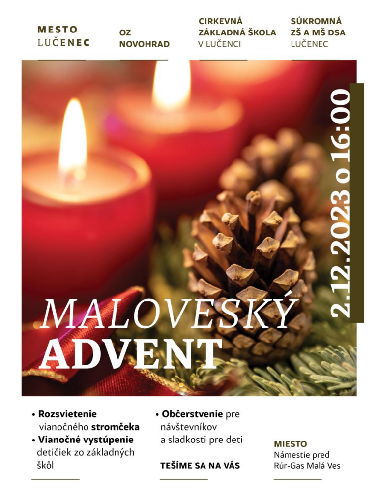 Mesto Lučenec, OZ Novohrad, Cirkevná základná škola v Lučenci a Súkromná základná škola a materská škola DSA Lučenec vás pozývajú 2. decembra na Maloveský advent. Na podujatí bude pripravené vianočné vystúpenie detí zo základných škôl, rozsvietenie vianočného stromčeka a tiež občerstvenie pre návštevníkov a sladkosti pre deti.