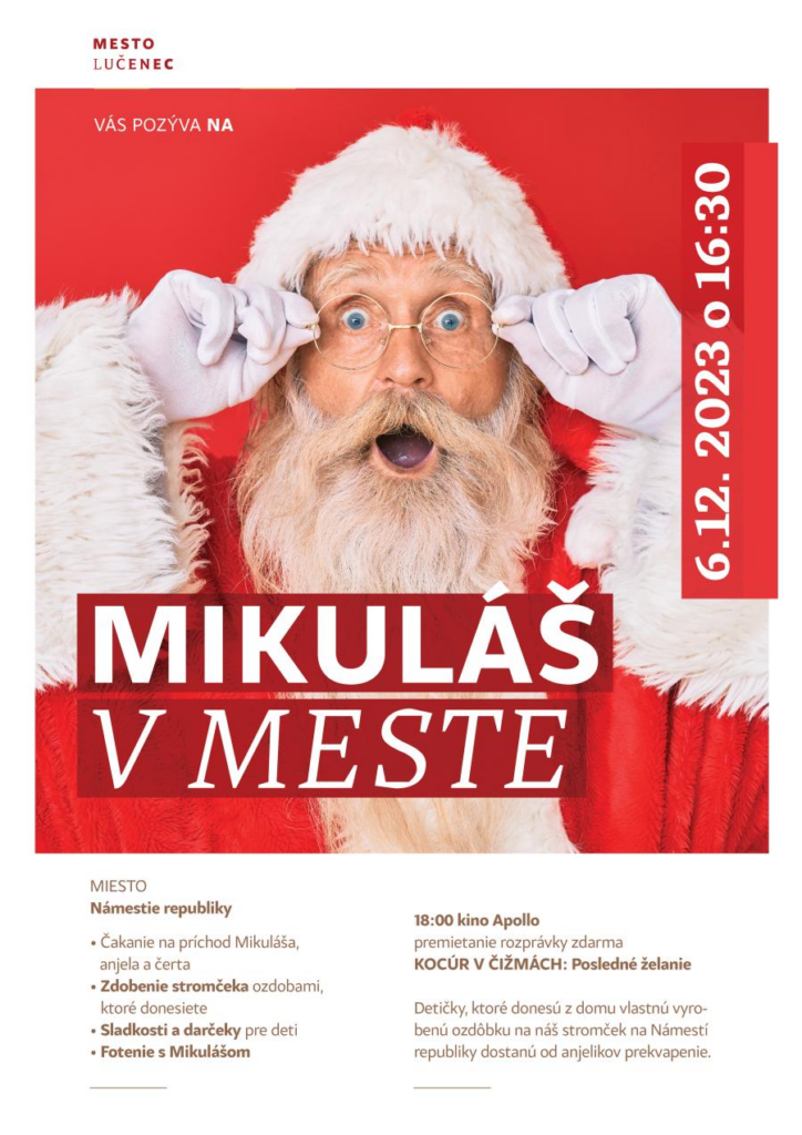 Aj tento rok príde Mikuláš so svojimi pomocníkmi. V stredu, 6. decembra, doobeda navštívia materské školy a poobede od 16:30 budú na Námestí republiky v Lučenci s deťmi ozdobovať vianočný stromček. Pripravené bude aj fotenie s Mikulášom a maskotmi.