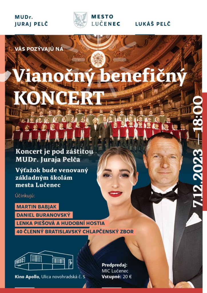 V Kine Apollo v Lučenci sa 7. decembra uskutoční Vianočný benefičný koncert, na ktorom bude účinkovať až 50 umelcov. Unikátne spojenie operného speváka Martina Babjaka s klaviristom Danielom Buranovským a Lenky Piešovej s vynikajúcimi hudobníkmi, plus 40-členný Bratislavský chlapčenský zbor, vystúpia vôbec prvýkrat v takomto zložení s vianočným repertoárom aj v Lučenci. Koncert je benefičný a výťažok bude putovať základným školám v zriaďovateľskej pôsobnosti mesta Lučenec.