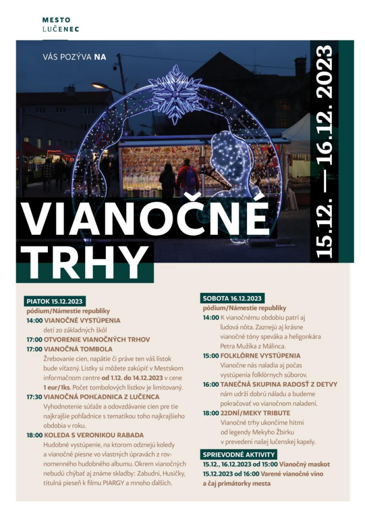 Lučenské vianočné trhy budú prebiehať v piatok a sobotu (15. a 16. decembra). Sprevádzané budú vystúpeniami detí zo základných škôl, hudobným programom aj chutnými dobrotami.