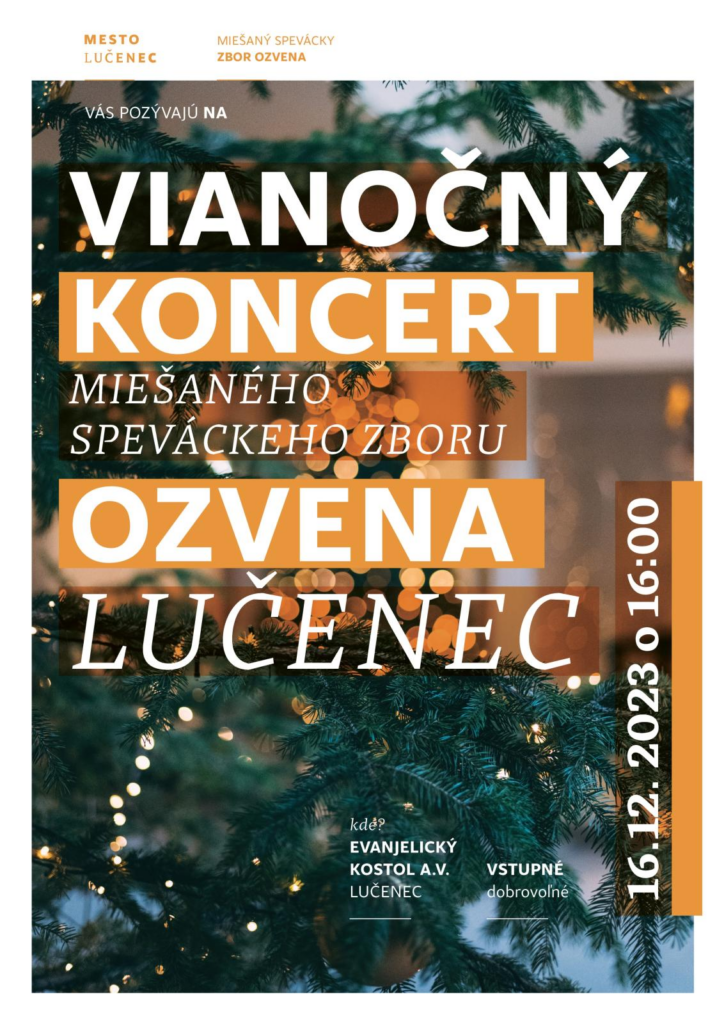 Na sobotu, 16. decembra, je pripravený aj vianočný koncert miešaného speváckeho zboru Ozvena, ktorý sa uskutoční od 16.00 hod. v Evanjelickom kostole a.v. v Lučenci. Odznejú vianočné a sakrálne skladby.