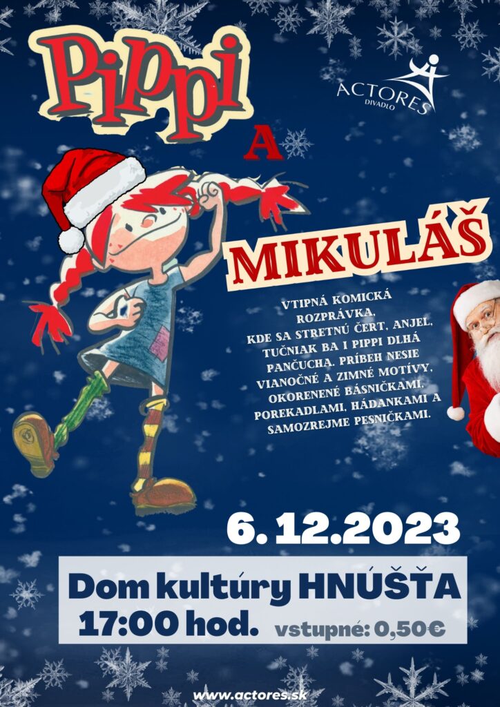 Nasledujúci deň, 6. decembra, v Dome kultúry privítajú Pipi Dlhú Pančuchu a Mikuláša. O 17:00 hod. na pódium zavítajú aj čert, anjel a tučniak a spoločne sa stretnú v komickej rozprávke, ktorá nesie vianočné a zimné motívy. Okorenená je básňami, porekadlami, hádankami aj piesňami.