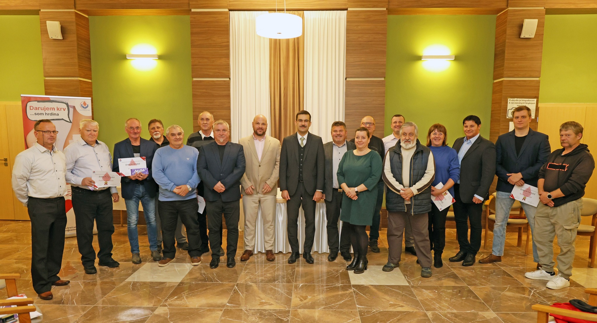 Približne dve desiatky pravidelných darcov krvi sa v utorok 11. novembra 2025 stretlo vo foyer mestského kultúrneho strediska, aby si z rúk primátora Attilu Agócsa prevzali ďakovné listy. Ocenenie získali tí, ktorí absolvovali minimálne dvadsať odberov.