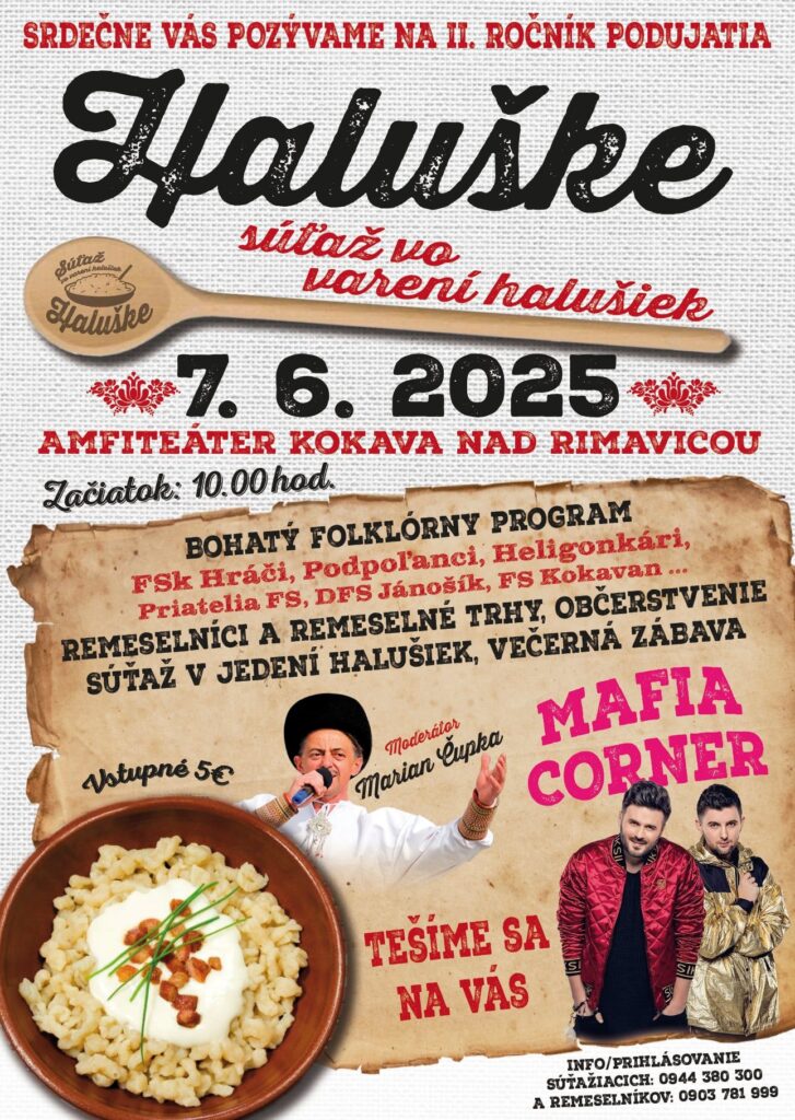 KOKAVA NAD RIMAVICOU - Milovníci tradičnej slovenskej kuchyne a folklóru sa majú na čo tešiť. Dňa 7. júna sa v amfiteátri Kokava nad Rimavicou uskutoční druhý ročník obľúbeného podujatia Haluške – súťaže vo varení halušiek. Podujatie odštartuje už o 10.00 a ponúkne bohatý program pre celú rodinu.