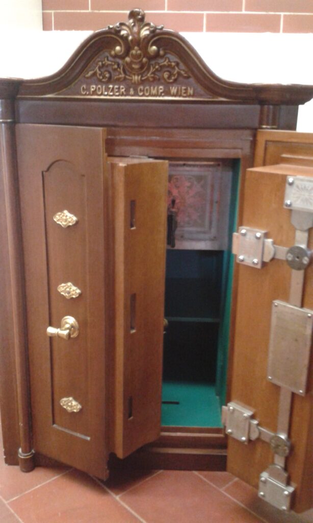 Ocitnú sa v miestnosti s dvomi trezormi. Do parády si vezmú ten menší, vyzerá byť schodnejší, ako masívny trezor stojaci pri stene. Menší trezor húževnato odoláva, až napokon je jeho dvojitý plášť prevŕtaný dostatočným množstvom otvorov, aby páčidlom mohli jeho steny roztvoriť. Z jeho vnútrajška vyťahujú lúpežníci 14.000 korún v hotovosti. Prakticky, je to almužna voči tomu, čo pôvodne chceli ukradnúť. Do veľkého trezoru sa síce tiež pustili, ale nebožiec sa im zlomil a tak nemali ďalej čím vŕtať.