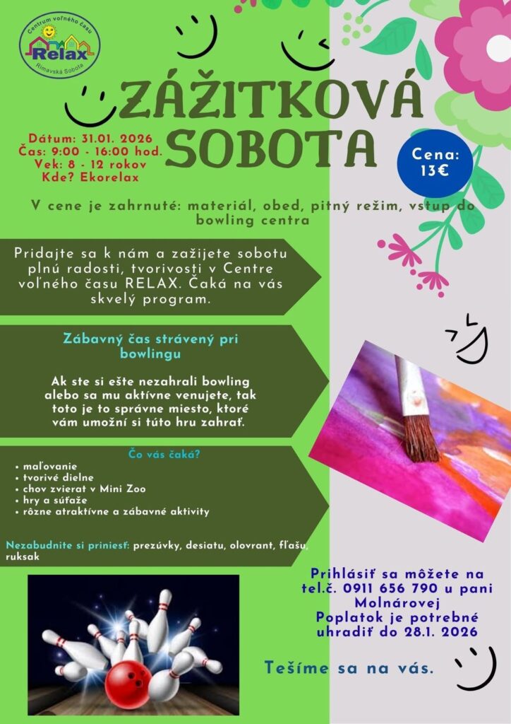Centrum voľného času RELAX v Rimavskej Sobote pripravilo pre deti atraktívne podujatie Zážitková sobota, ktorá sa uskutoční v sobotu 31. januára 2026 v priestoroch Ekorelaxu. Program je určený pre deti vo veku 8 až 12 rokov a bude prebiehať v čase od 9.00 do 16.00 hodiny. Organizátori sľubujú deň plný radosti, pohybu, tvorivosti a nezabudnuteľných zážitkov.