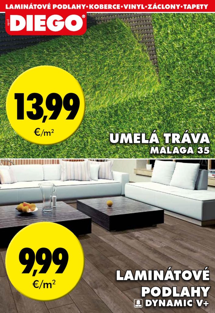 Aprílová ponuka v predajni DIEGO vás zaručene poteší. V hlavnej úlohe sa tento mesiac predstaví obľúbená umelá tráva Malaga alebo Erba vo výhodnej cene. V DIEGO aj naďalej nájdete napríklad kvalitné laminátové podlahy a vodeodolné podlahové krytiny v roliach i moduloch. Tie sú dokonalou náhradou studenej dlažby.