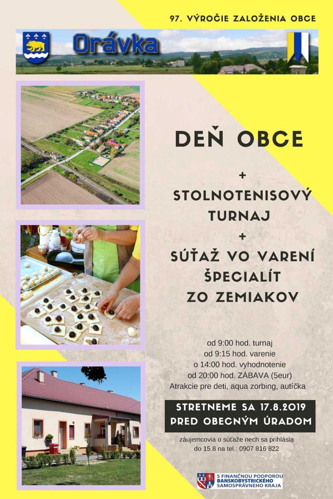 Obec Orávka oslavuje 17. augusta, a to stolnotenisovým turnajom a súťažou vo varení špecialít zo zemiakov. Nebudú chýbať ani atrakcie pre deti a večerná zábava.