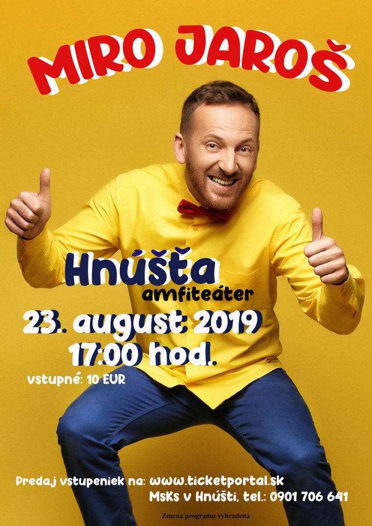 O pár dní neskôr (23.8.) zavíta do Hnúšte so svojom koncertom Miro Jaroš. V typickej žltej košeli s červeným motýlikom pomocou pesničiek naučí deti, ako si majú umývať ruky a zúbky, ako poďakovať či poupratovať si hračky.