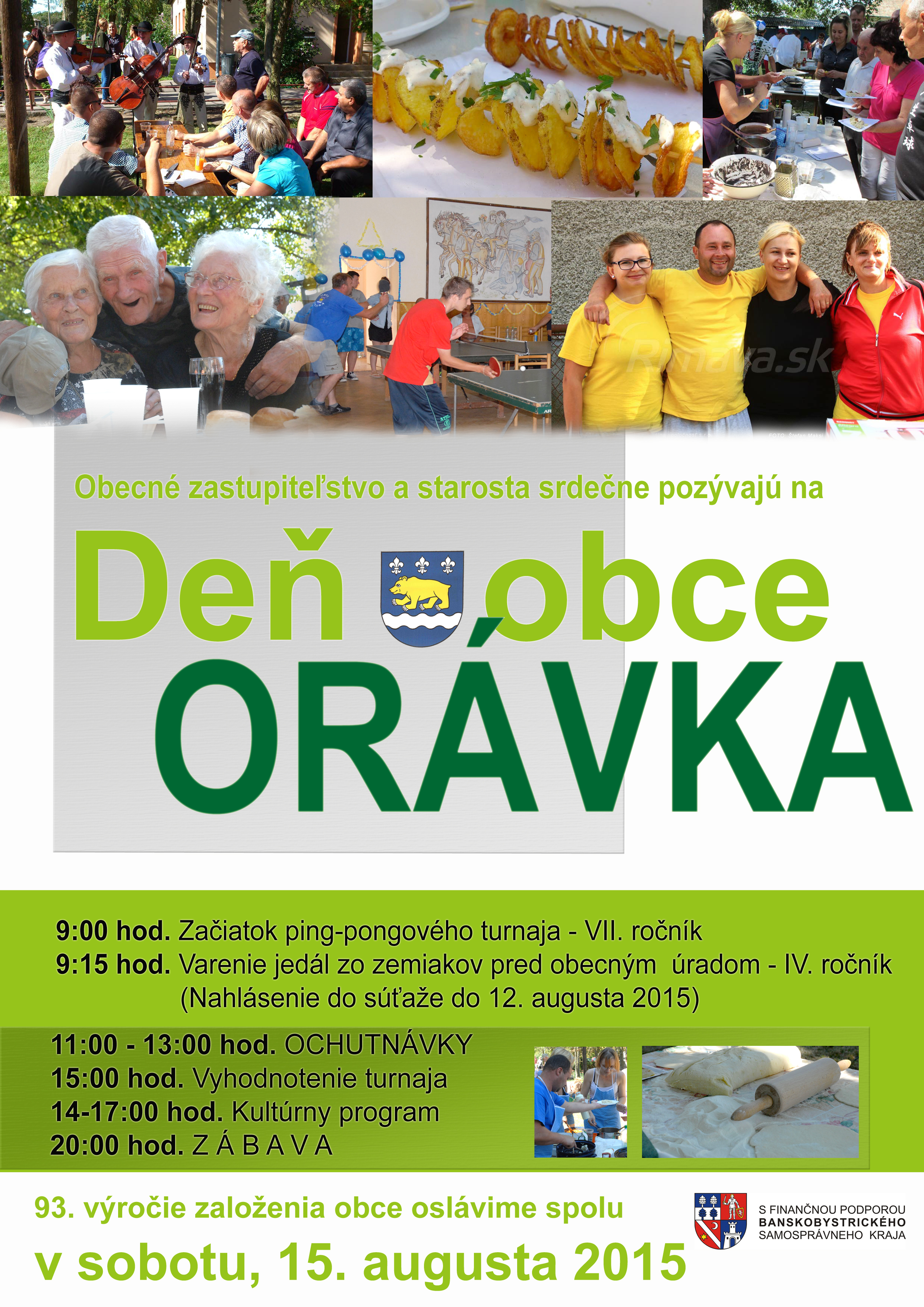 Sobota, 15. augusta, bude rovnako bohatá na akcie. Orávka oslávi Deň obce, na ktorom nebude chýbať súťaž vo varení jedál zo zemiakov. Neďaleko obce Gortva, na statku Bízovo, sa uskutoční nultý ročník amatérskych westernových rýchlostných pretekov. Sobotu plnú podujatí zakončí One Day Fest na rimavskosobotskom Amfiteátri, na ktorom podľa Špitalovej vystúpia kapely The Paranoid, Before the zero day, Brainscan, From our hands, Wastage, John Wolfhooker a Slice of bread.