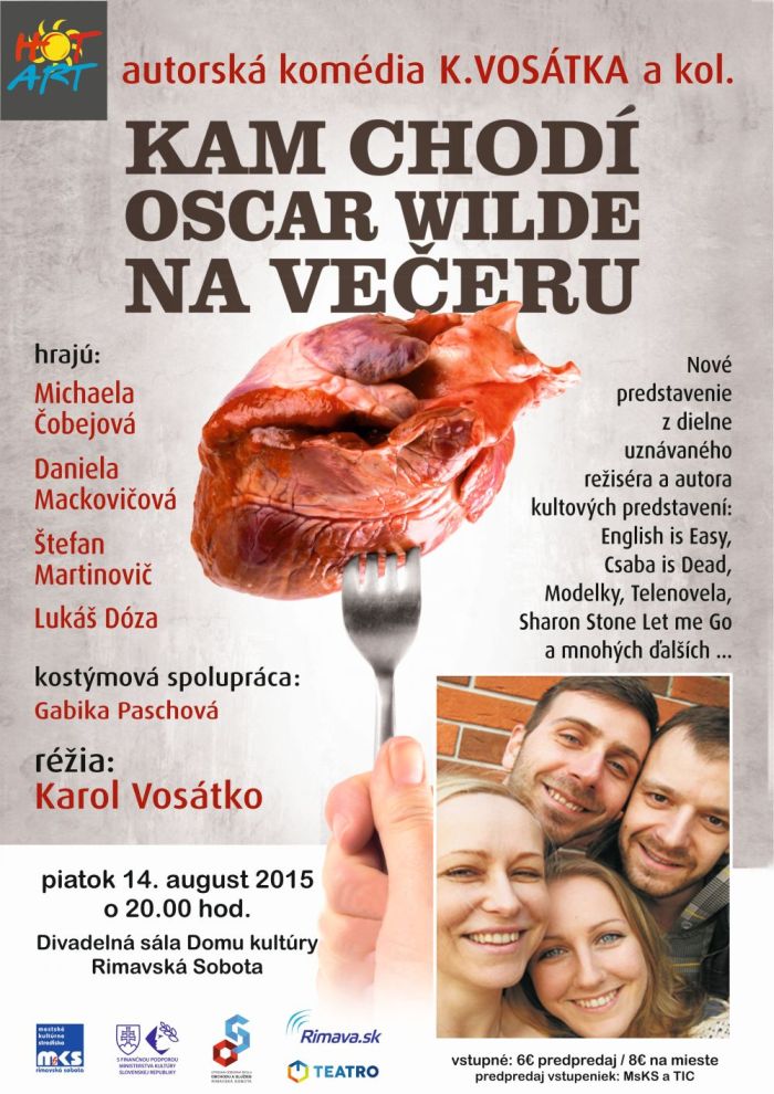 Hot art vám v piatok, 14. augusta, ponúkne komédiu, ktorá vám zaručene zlepší náladu. Predstaveniu s názvom Kam chodí Oscar Wilde na večeru z dielne uznávaného režiséra a autora kultových predstavení Karola Vosátka, bude patriť Divadelná sála Domu kultúry v Rimavskej Sobote.