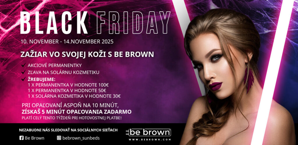 Najlepší čas zažiariť vo svojej koži prichádza práve teraz! Solárne štúdio Be Brown prichádza s poslednou veľkou akciou tohto roka – Black Friday, ktorá trvá od 10. do 14. novembra 2025. Zľavy, výhody aj atraktívna súťaž budú dostupné pre zákazníkov v Rimavskej Sobote aj v Rožňave.