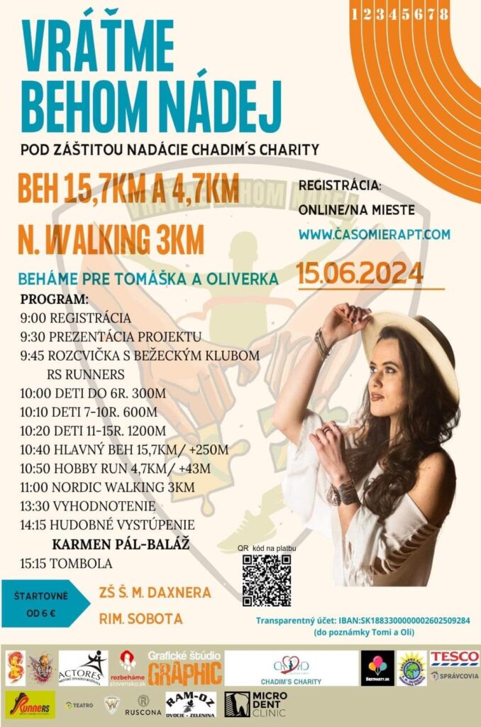 Hlavnou organizátorkou behu, ktorý prebehne pod záštitou Nadácie Chadim´s charity, je Marcela Vrábeľová. Beh sa uskutoční 15-teho júna spred Základnej školy Š. M. Daxnera v Rimavskej Sobote. Registrácia začína o 9.-tej hodine na mieste konania akcie. Do behu sa dá prihlásiť aj online NA TOMTO MIESTE.