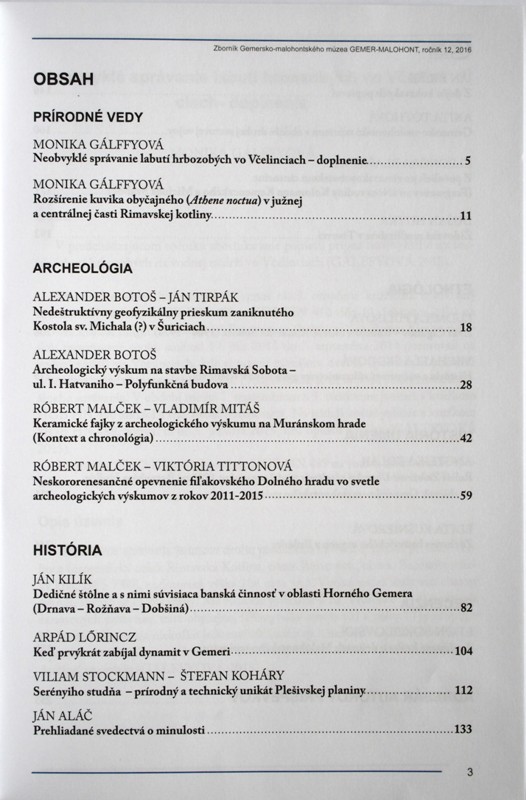 Podľa jej slov Monika Gálffyová, biologička GMM, oboznámi čitateľov s výskytom a rozšírením kuvika obyčajného v južnej a centrálnej časti Rimavskej kotliny ako aj s neobvyklým správaní labutí hrbozobých vo Včelinciach. V odbore archeológia zborník prináša výsledky nedeštruktívneho geofyzikálneho prieskumu zaniknutého Kostola sv. Michala v Šuriciach, ktorý vykonal Ján Tirpák z Gemologického ústavu Fakulty prírodných vied UKF v Nitre v spolupráci s archeológom GMM Alexandrom Botošom, ktorý je zároveň autorom aj druhého príspevku, prinášajúceho výsledky archeologického výskumu na Hatvaniho ulici v Rimavskej Sobote. „Zaujímavé nálezy keramických fajok pochádzajú z archeologického výskum na Muránskom hrade, o čom referujú autori Vladimír Mitáš a Róbert Malček,“ priblížila historička, podľa ktorej z pera Malčeka a Viktórii Tittonovej je i archeologický príspevok z Novohradu.