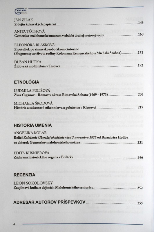 V zborníku sa čitatelia dozvedia aj niečo o dejinách kokavských papierní, ktorým sa vo svojej štúdii venuje Ján Žilák. Publikácia obsahuje aj príspevok Gemersko-malohontské múzeum v čase druhej svetovej vojny, a to od historičky GMM Anity Tóthovej. Eleonóra Blašková sa venuje životu členov rodiny Kemenczkých a Szabó, ktorí hoci pôsobili prevažne v Košiciach ich miestom posledného odpočinku sa stal cintorín v Rimavskej Sobote. Osudy židovskej modlitebne v Tisovci približuje príspevok Dušana Hutku.