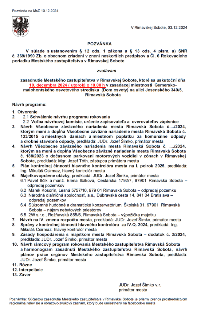 RIMAVSKÁ SOBOTA - Zajtra, 10. decembra, sa uskutoční zasadnutie Mestského zastupiteľstva (MsZ), ktorého hlavnými bodmi programu budú dane a zmena rozpočtu mesta.
