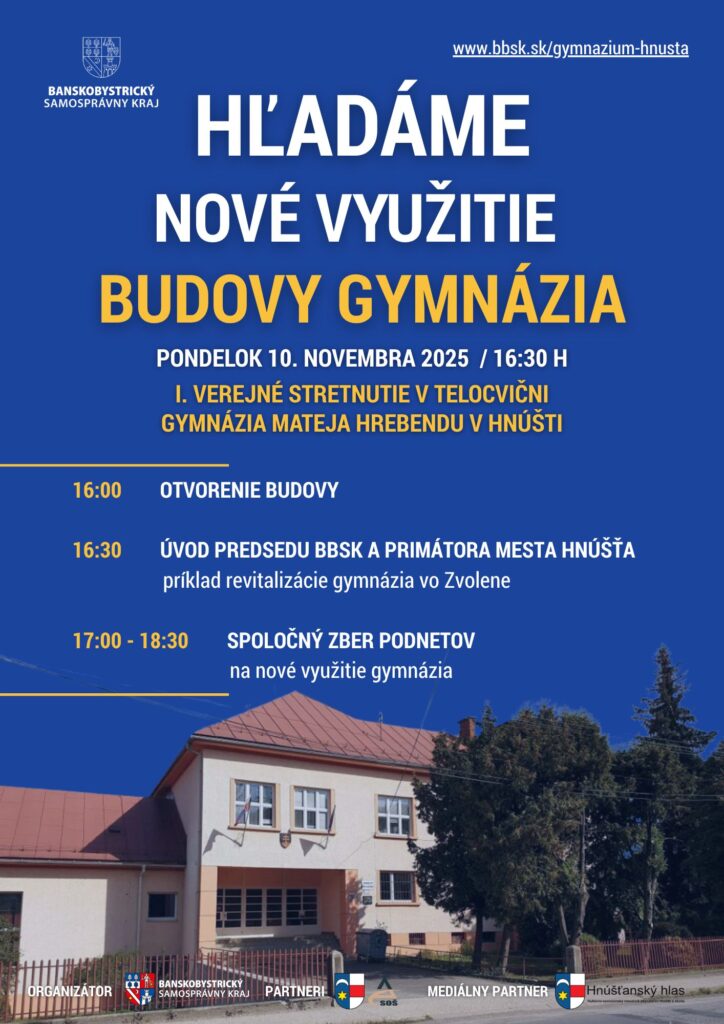 ​Verejné stretnutie na tému "Hľadáme nové využitie budovy gymnázia" sa uskutoční v pondelok 10. novembra 2025 o 16:30 hodiny v telocvični Gymnázia Mateja Hrebendu v Hnúšti.