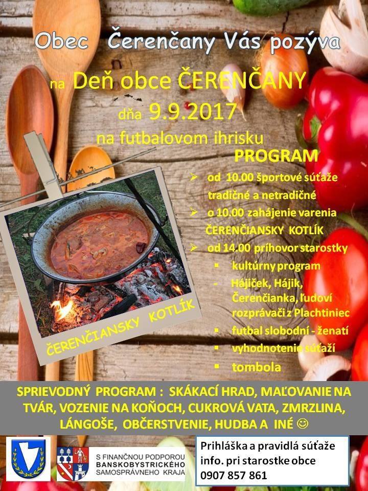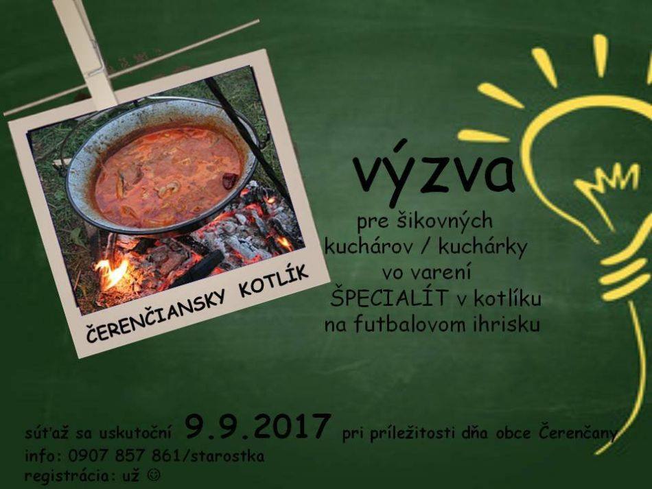 A hoci na tenisovom turnaji sa o občerstvenie postará spoločnosť Koro, o dobré jedlo nebude núdza ani v obci Čerenčany, ktorá v sobotu oslávi svoj Deň obce. Už od 10:00 hod. na vás čakajú tradičné i netradičné športové súťaže, kultúrny program či futbal, v ktorom nastúpia slobodní proti ženatým. Deti sa budú môcť vyhrať na skákacom hrade, povoziť sa na koňoch či nechať si namaľovať niečo na tvár. A okrem cukrovej vaty, zmrzliny či langošov si pochutíte i na guľáši, ktorý pripravia družstvá v rámci súťaže Čerenčiansky kotlík, kde oheň pod kotlami zapália o 10:00 hod.
