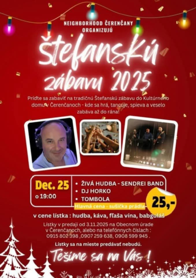 Už dnes sa môžu priaznivci dobrej zábavy vybrať na Štefanskú zábavu do Oždian, ktorú organizujú miestni hasiči DHZO. Rovnako dnes sa koná aj Štefanská zábava v Čerenčanoch v Kultúrnom dome, kde do tanca zahrá živá hudba Sendrei Band. Atmosféra sviatkov bude pokračovať aj na Vianočnej zábave na Teplom Vrchu.