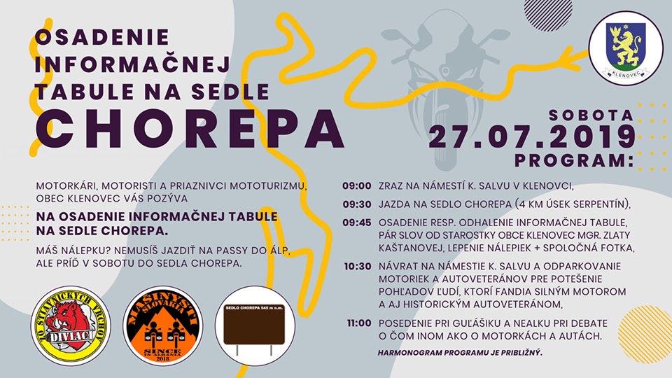 „Všimli sme si, že sa nám na Chorepe zastavujú motorkári, tak sme tam osadili tabuľu. Niekto tu už aj prenocoval,” povedala pre Rimava.sk starostka Klenovca Zlata Kaštanová. Podľa jej slov nejde o zákazovú tabuľu, ale po vzore veľkých turistických priesmykov v zahraničí ide o tabuľu, na ktorej si motorkári mohli nalepiť svoju klubovú nálepku. V okolí sú v tomto podľa starostky jedinečný na okolí a zrejme asi aj na Slovensku. „Veľa si od toho nesľubujeme, ide len o zatraktívnenie, niečoho pre skupinku motorkárov. Už nám sem pribudli prvé tri nálepky,” priblížila starostka Klenovca a dodala, že s nápadom prišiel jej syn, ktorý patrí k veľkým cestovateľom na motorke. „Porozumenie našiel aj u mojich kolegov,” dodala Kaštanová s tým, že náklady boli nízke, približne 100 eur na tabuľu. „Zvyšok spravili zamestnanci obce keď vyčistili okolie pomníka na 75-te výročie SNP. Trvalo to celý deň a bola to ich dobrovoľná práca,” dodala starostka.