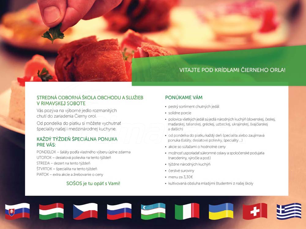 Slovenské, maďarské, grécke či talianske národné jedlá. Tieto a mnohé ďalšie domáce špeciality rôznych krajín sveta môžete ochutnať v reštauračnom zariadení Čierny orol v Rimavskej Sobote. Od pondelka do piatku si pochutnáte na tých najlepších medzinárodných jedlách, ktoré sú pripravované z čerstvých surovín. Chuťovým bunkám každý deň ulahodia aj špeciality a lahodne zaujímavá ponuka šalátov, dezertov či polievok. Celkový dojem doladí kultivovaná obsluha mladých študentov Strednej odbornej školy obchodu a služieb (SOŠOS) v Rimavskej Sobote. Solídne porcie a príjemný personál je zárukou, že z Čierneho orla určite budete odchádzať spokojní nielen na žalúdku, ale aj na duši.