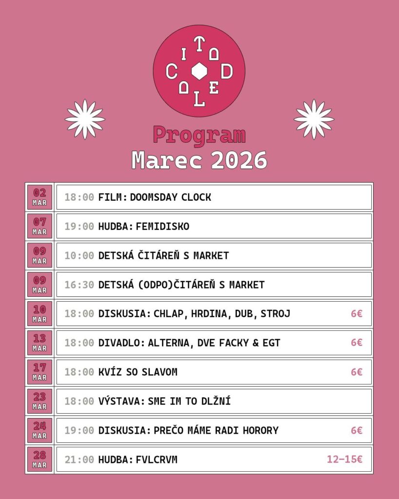 Program Citadely na marec 2026 ukazuje, že ide o priestor, ktorý spája komunitu, reaguje na spoločnosť a vytvára bezpečné miesto pre otázky, pochybnosti aj radosť z umenia. Nie je to len kultúrny kalendár – je to pozvánka premýšľať, diskutovať a byť súčasťou mesta aktívne.