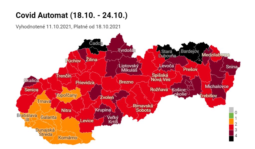 Od pondelka 18. októbra bude na covid mape svietiť päť okresov čiernou farbou. Ide o okresy Bardejov, Čadca, Svidník, Kysucké Nové Mesto a Stará Ľubovňa, kde začnú platiť výrazné obmedzenia aj pre zaočkovaných ľudí.