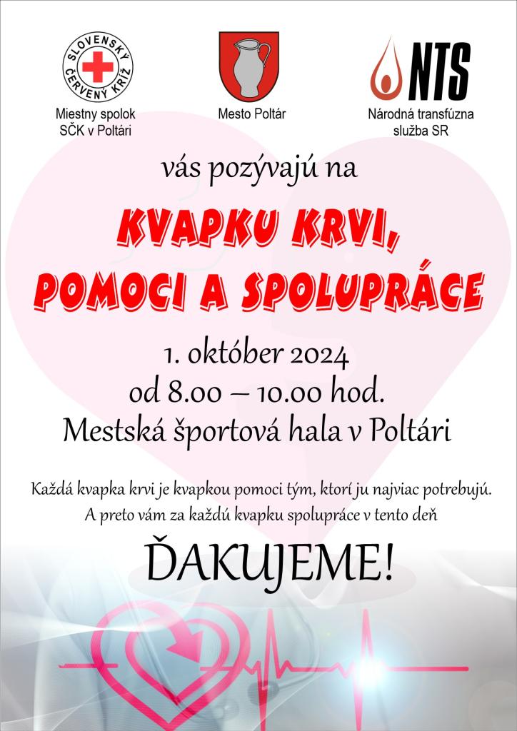 POLTÁR - Mesto Poltár v spolupráci s Miestnym spolkom Slovenského Červeného kríža a Národnou transfúznou službou SR pozýva všetkých občanov na darovanie krvi. Podujatie s názvom Kvapka krvi sa uskutoční 1. októbra v Mestskej športovej hale v Poltári. Prijímať darcov sa bude od 8:00 do 10:00.