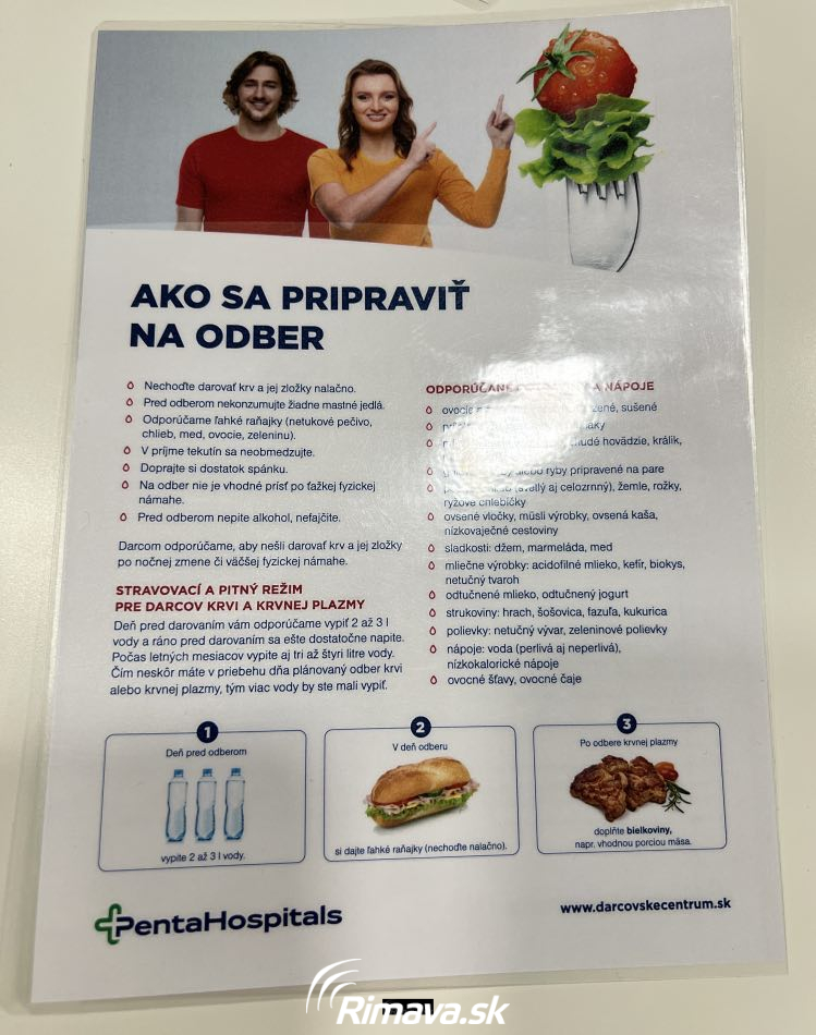 Dôležité je aj to, čo darca je pred odberom. "Ideálne raňajky pred odberom sú chlebík s džemom, chlebík s medom, kávička môže byť a dôležité je, aby sa človek pred odberom nezaťažoval. Ak sa zaťažíte vo fitku, odbehnete maratón alebo sa preťažíte v ťažkej manuálnej práci, môžu stúpnuť pečeňové testy," dodala pani doktorka s úsmevom.