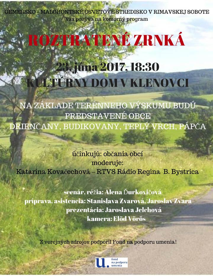 Budikovany, Drienčany, Pápča a Teplý Vrch. Obce, ktoré určite pozná každý Rimavskosoboťan. No poznáte aj ich históriu? Tú môžete spoznať aj vďaka komornému programu Roztratené zrnká. Históriu spomenutých obcí, kedy v nich obyvatelia žili obyčajným dedinským životom môžete spoznať už po 7-krát, a to v piatok, 23. júna od 18:30 hod. v Kultúrnom dome v Klenovci.