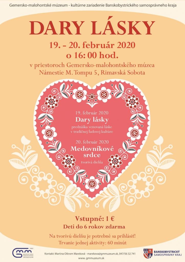 Hoci počas 14. februára slávia meniny nositelia mena Valentín je to aj deň všetkých zaľúbených. Tento sviatok si posledné roky získal čoraz viac pozornosti. A i keď môže tento sviatok pôsobiť ako novodobý, má svoju históriu. Tú sa dozviete 19. až 20. februára 2020 v priestoroch Gemersko-malohontského múzea v Rimavskej Sobote, kde uskutoční podujatie Dary lásky, venované prejavom lásky v tradičnej ľudovej kultúre. Rimava.sk o tom informovala Martina Oštrom Mareková, PR-referentka múzea.
